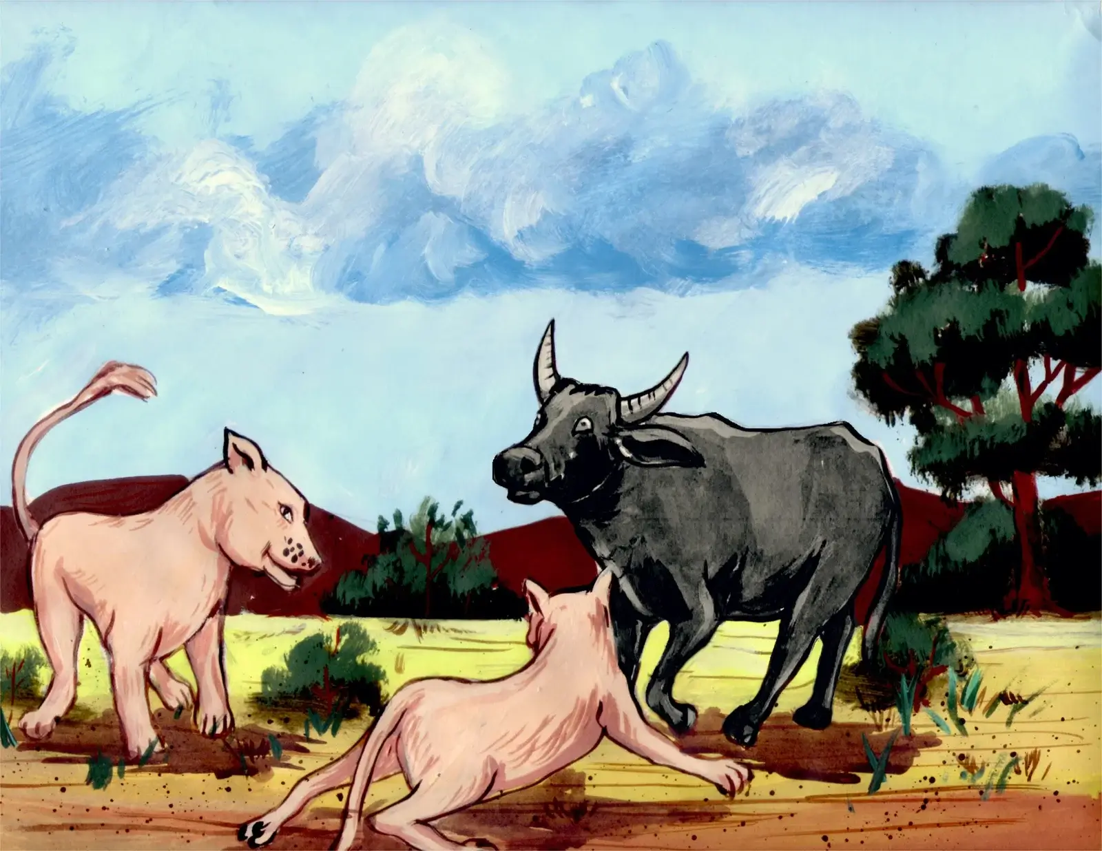 ‘Once upon a time, there were four oxen that lived in the high hills. They were happy and content with their life. But one day this all came to an end. Wild beasts began roaming the hills where the oxen lived. What could the oxen do to protect themselves? what would be their main weakness? This old Eritrean folktale shows how solidarity is our greatest strength when faced with danger.’